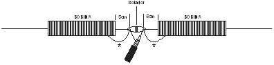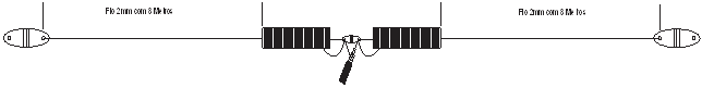 Cada “perna” da antena possui um comprimento de 8 metros de extensão. Na parte central da antena temos 2 bobinas conforme o desenho abaixo que tem um afastamento de 5 centímetros para cada lado do isolador central.