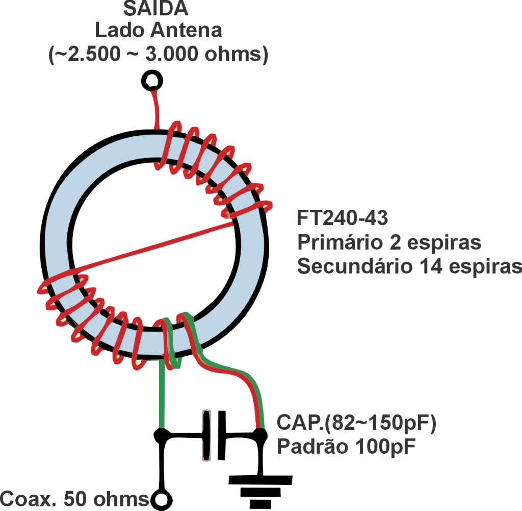 • Capacitor de compensação: 82 pF a 150 pF, 2 kV (ajuda na faixa de 20 a 10 m).