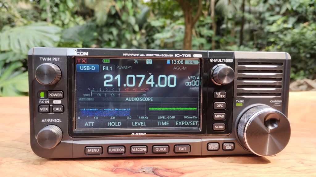 Também utilizo um Icom IC-705 que gosto muito por sua facilidade de conexão por wi-fi, bluethoth, chamador automático, ter as bandas de HF, VHF e UHF tudo em um só equipamento.
